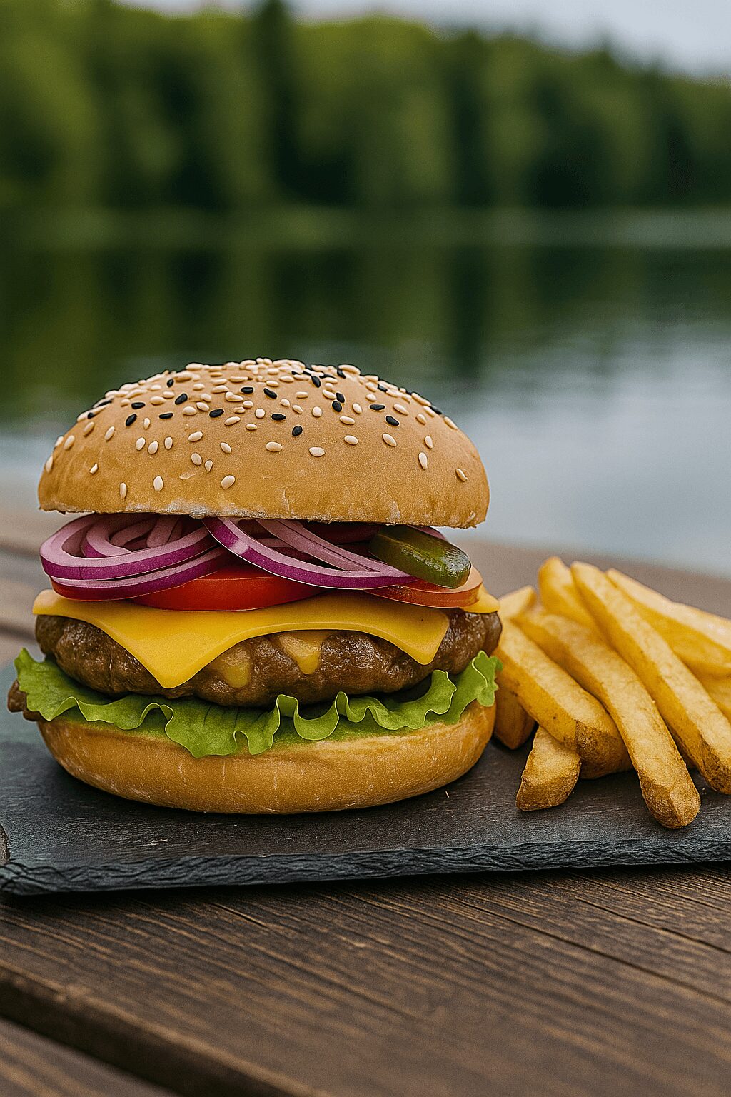 Nuestra hamburguesa Clásica combina la carne 100% vacuno con el frescor de tomate, lechuga, pepinillo y cebolla morada, coronado con queso cheddar y mayonesa Kraft. Un almuerzo tradicional y delicioso en el corazón del Lago Vichuquén. Incluye papas fritas.
