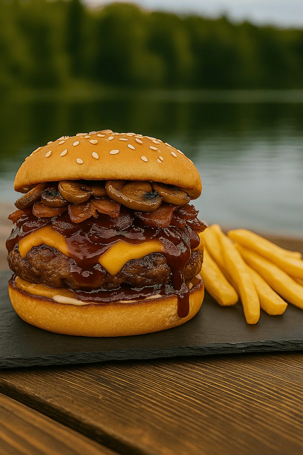 La Kochü Premium es una joya entre nuestras hamburguesas artesanales en el Lago Vichuquén. Con carne 100% de vacuno, tocino crocante, champiñones salteados, cebolla caramelizada, queso cheddar, salsa BBQ y mayonesa Kraft. Un almuerzo completo ideal para los fanáticos de los sabores intensos y de calidad. Incluye papas fritas de acompañamiento.