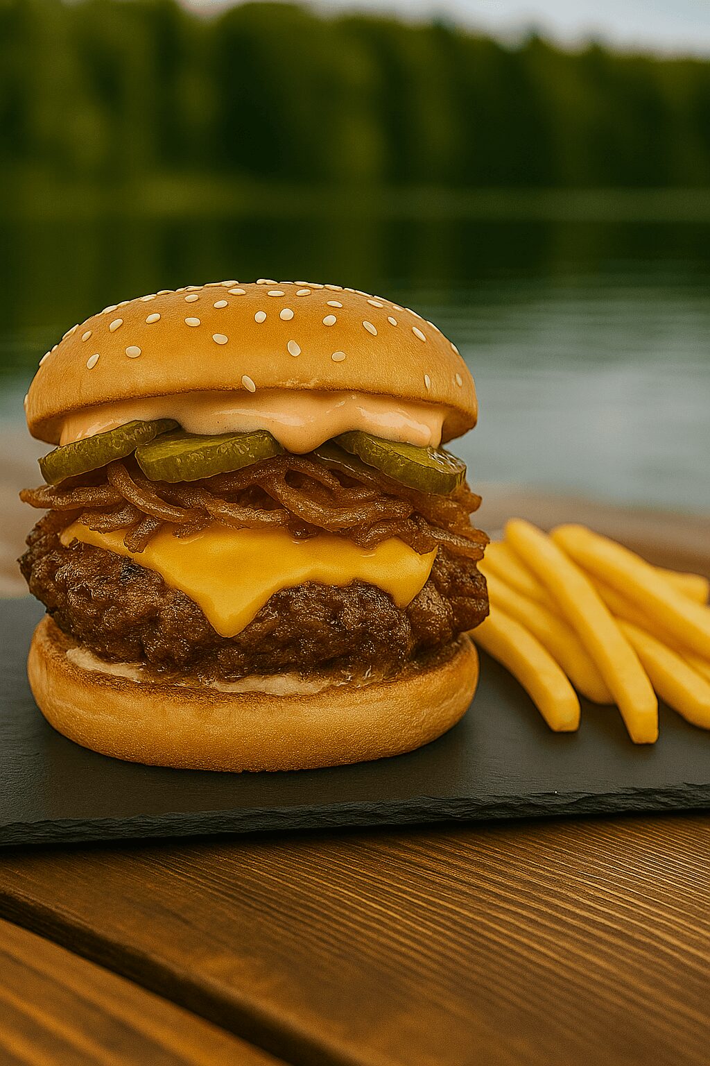 La hamburguesa Oklahoma destaca por su mezcla única de cheddar derretido, cebolla frita crujiente, pepinillos y nuestra inigualable salsa casera Oklahoma. Hecha con carne 100% vacuno, es una opción sabrosa y diferente para quienes buscan almuerzos contundentes en el Lago Vichuquén. Incluye papas fritas.