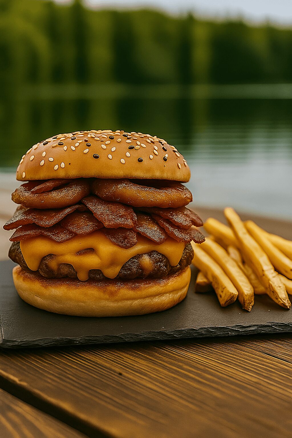La Super Bacon es una hamburguesa intensa: doble cheddar, doble tocino, aros de cebolla y un toque de salsa BBQ. Elaborada con carne 100% vacuno. Ideal para quienes buscan almuerzos potentes en el Lago Vichuquén. Viene con papas fritas incluidas.